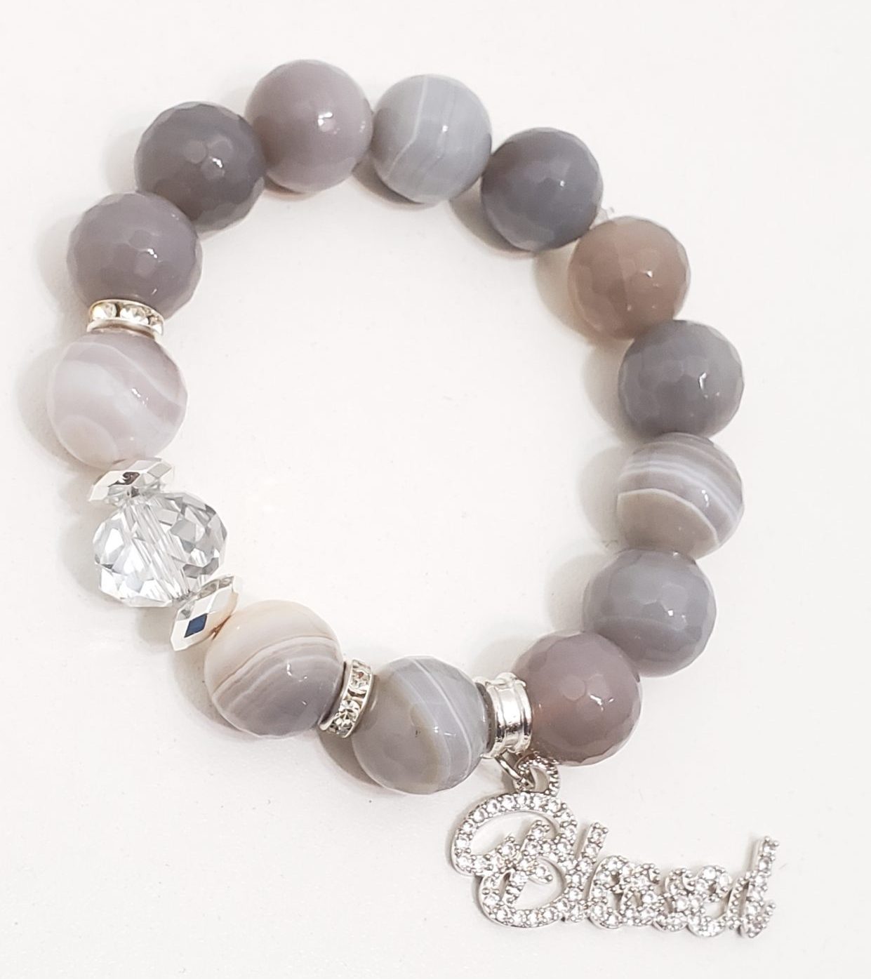16″ Silver charms and Grey Agate semi precious stone blessed charm stackable bracelet.