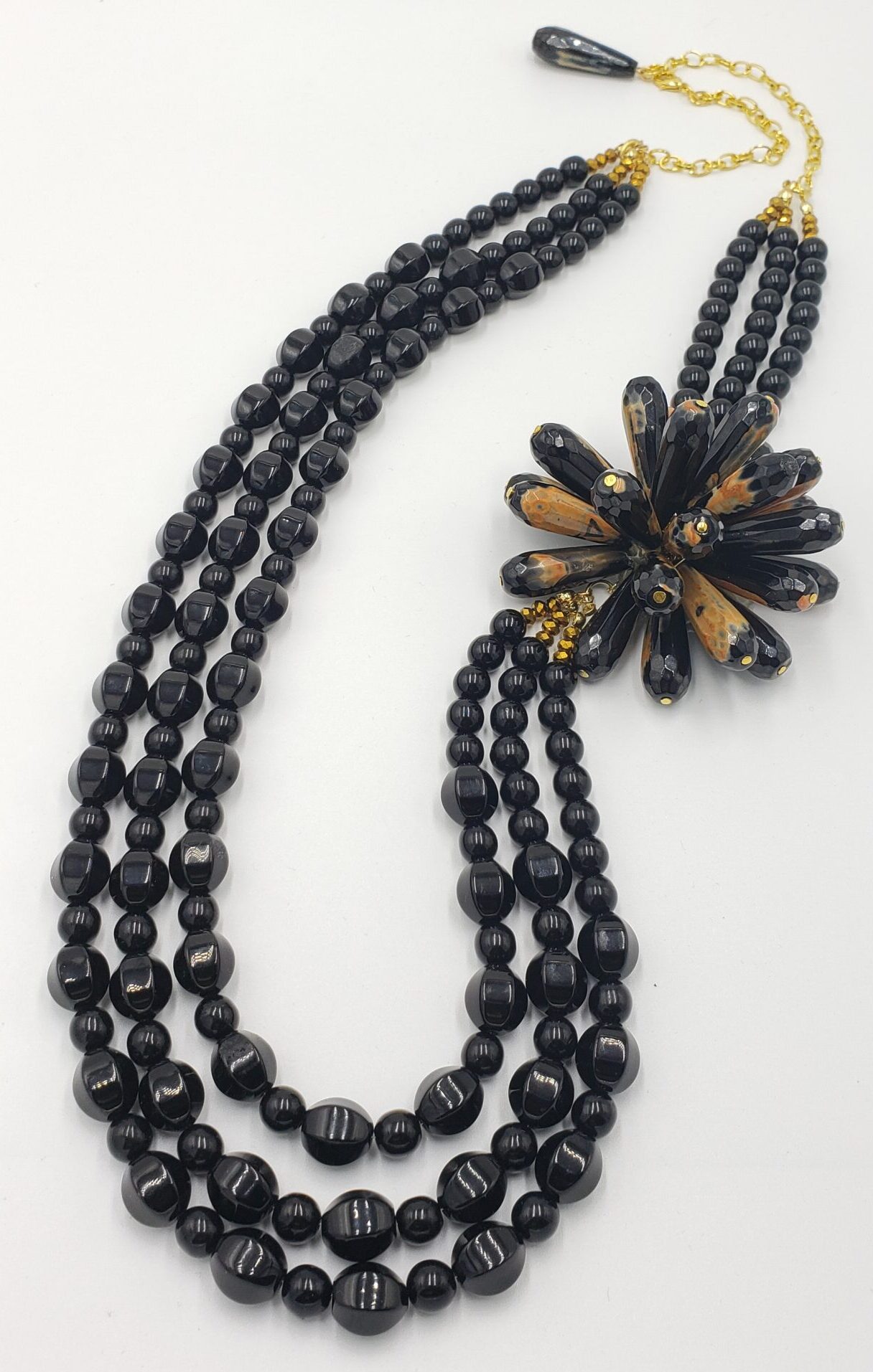 Black Onyx triple strand and orange textured Agate flower, 15 ” length.