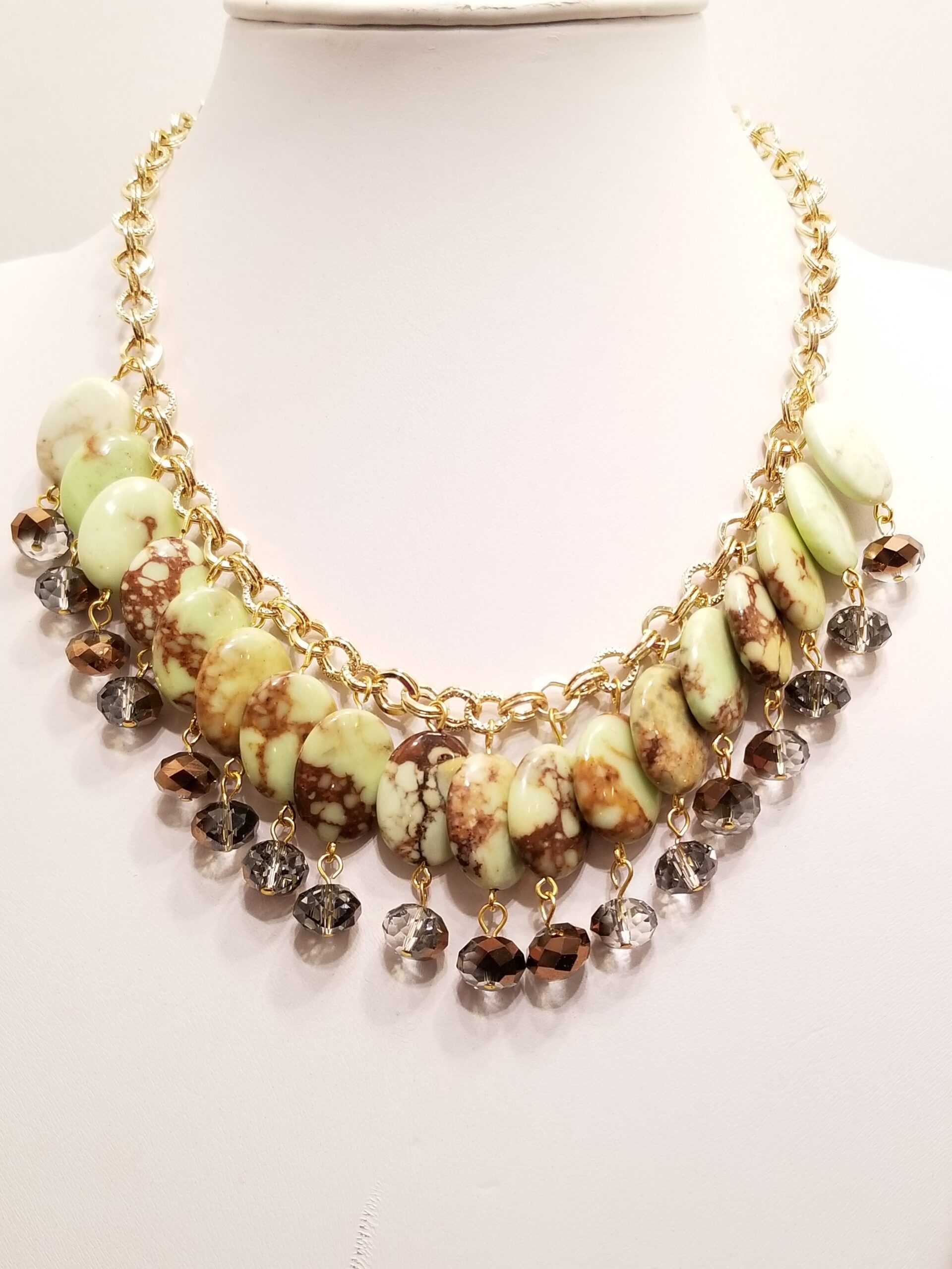 Chrysophrase and glass, gold chain necklace 14″ long.