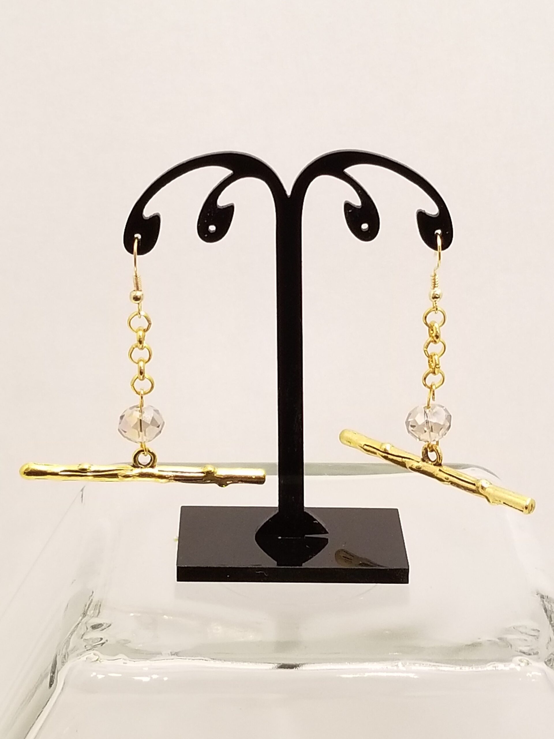 Gold bar earrings with fired glass stone.