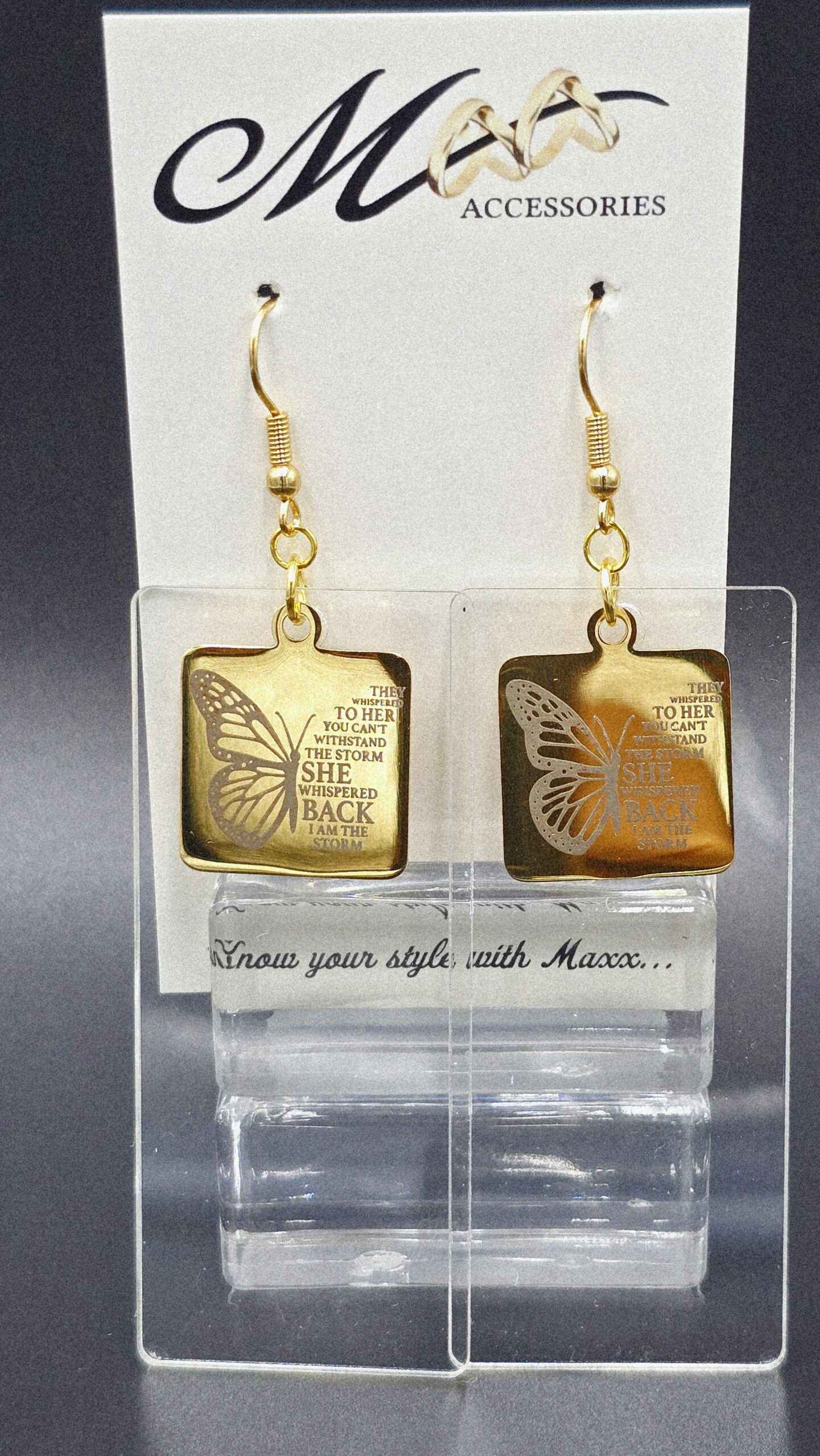I AM … COLLECTION, Gold square stainless pendant on a resin clear disk. butterfly, words of inspiration -” They whispered to her you can’t withstand the storm she whispered back I am the storm.”