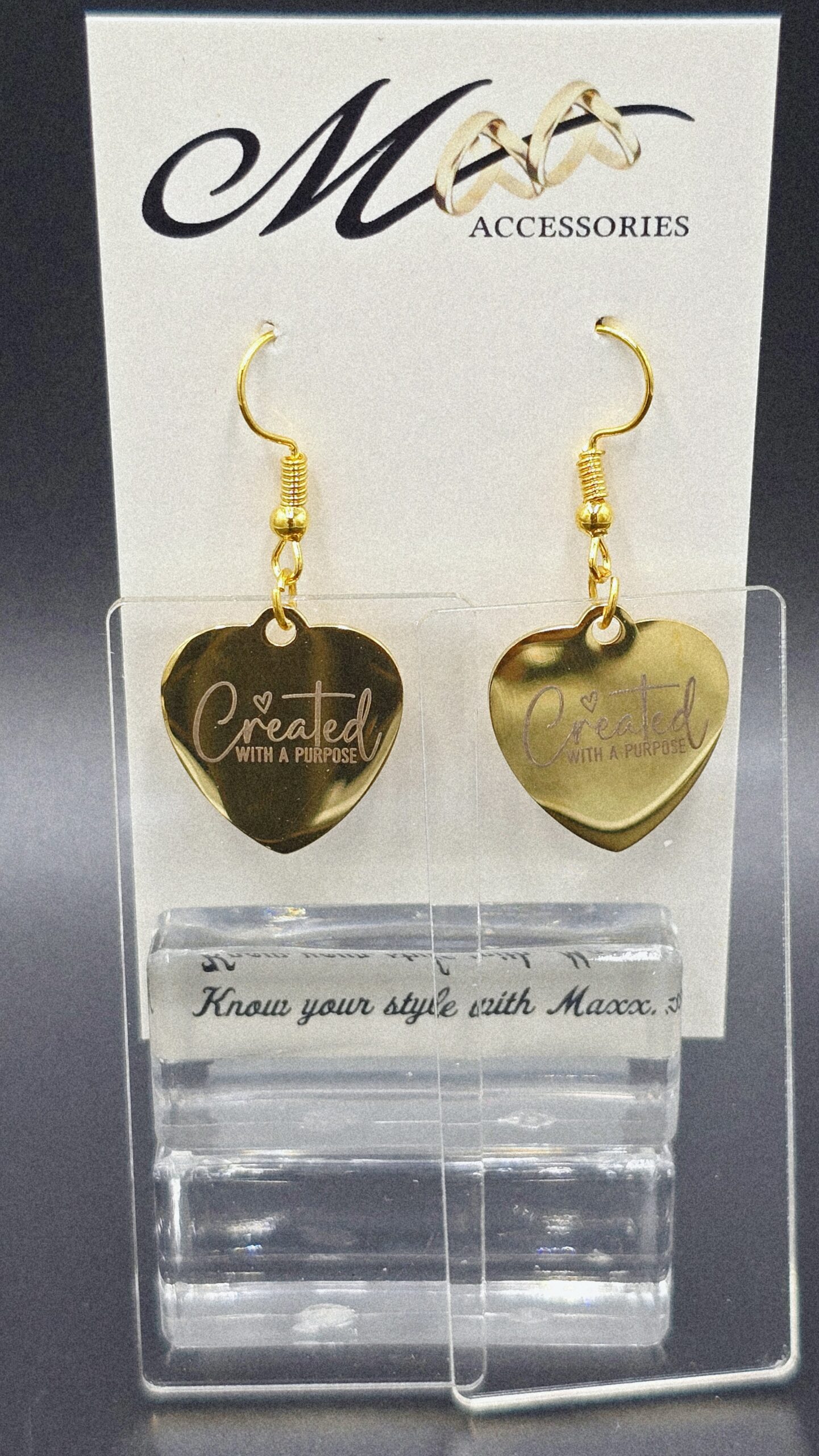 I AM… CREATED with a purpose. Stainless steel gold heart with resin oblong disk. gold fish-hook ear hooks. 2 inches long.
