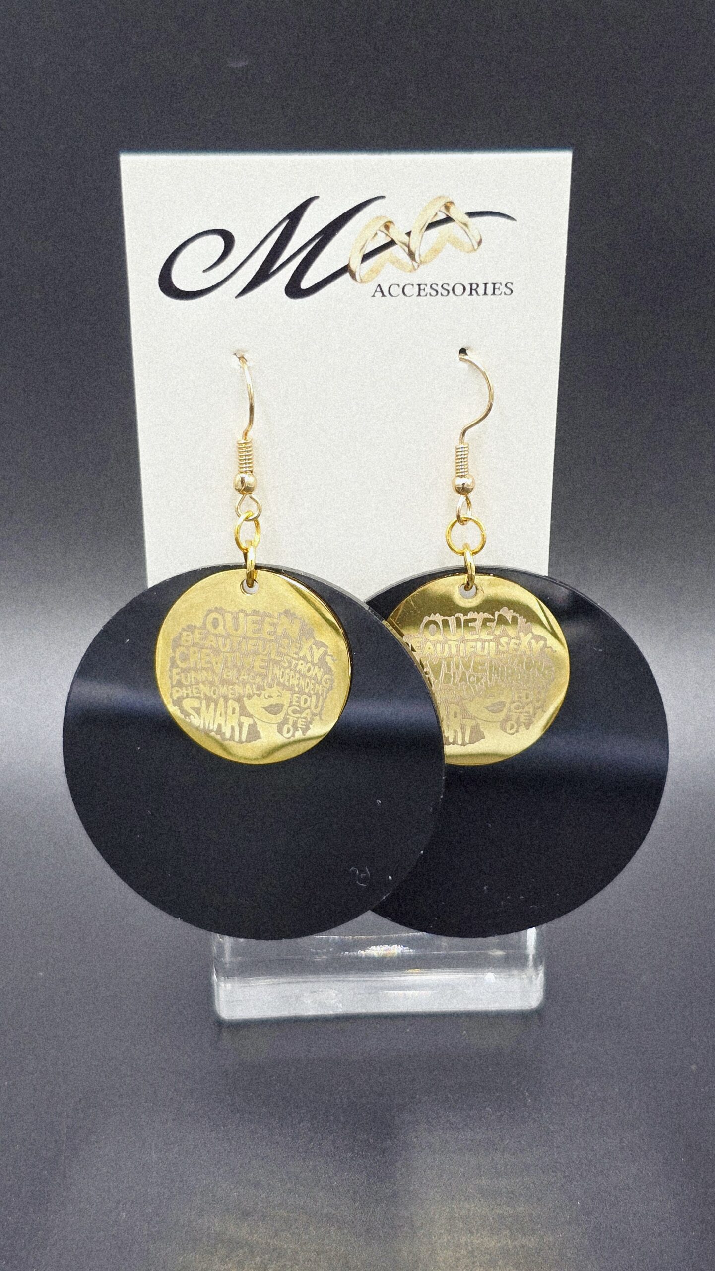 Stainless steel gold pendants with words of inspirational quotes on a resin black disk.