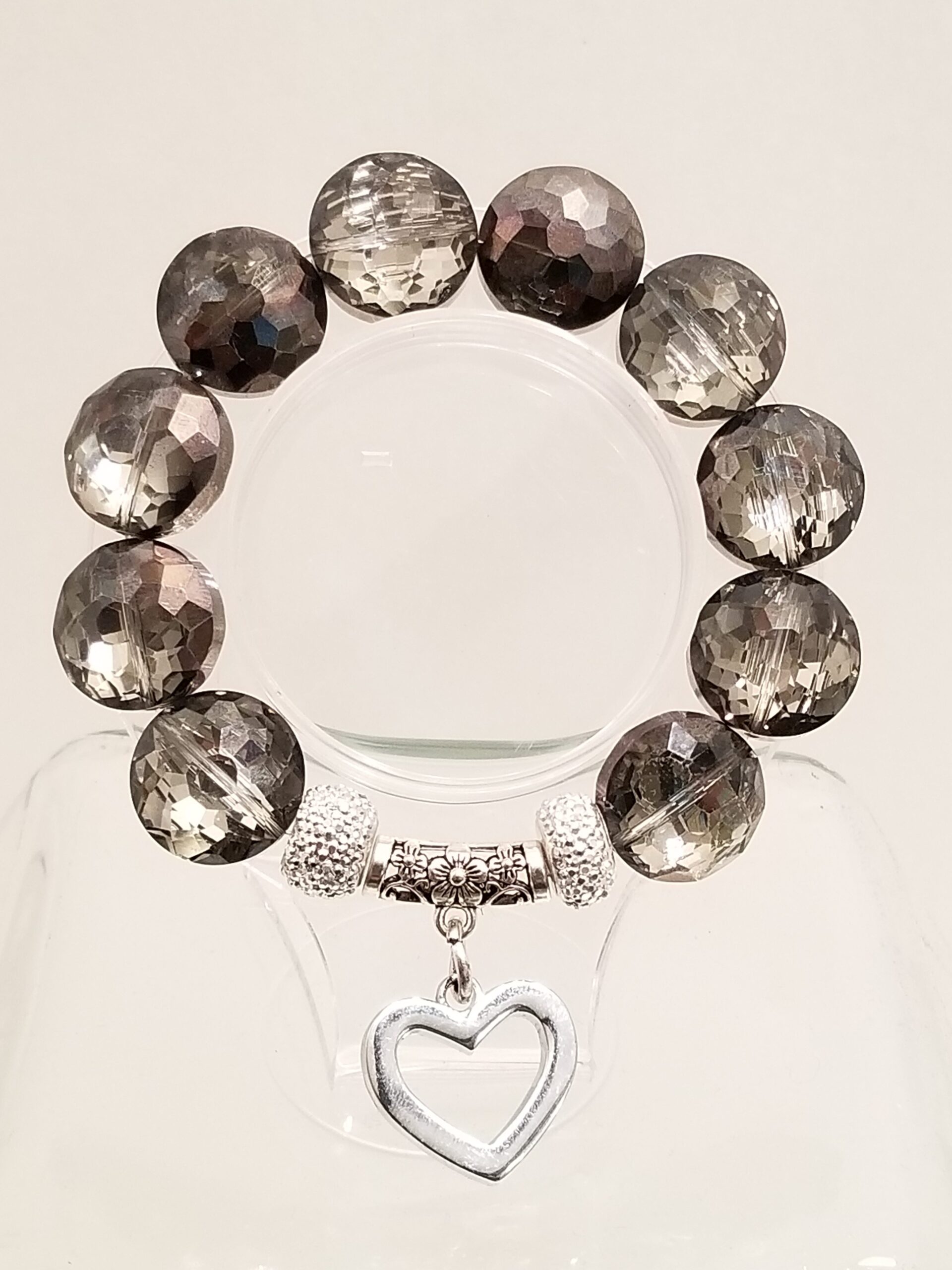 Fired glass grey beads stretch bracelet with heart pendant.