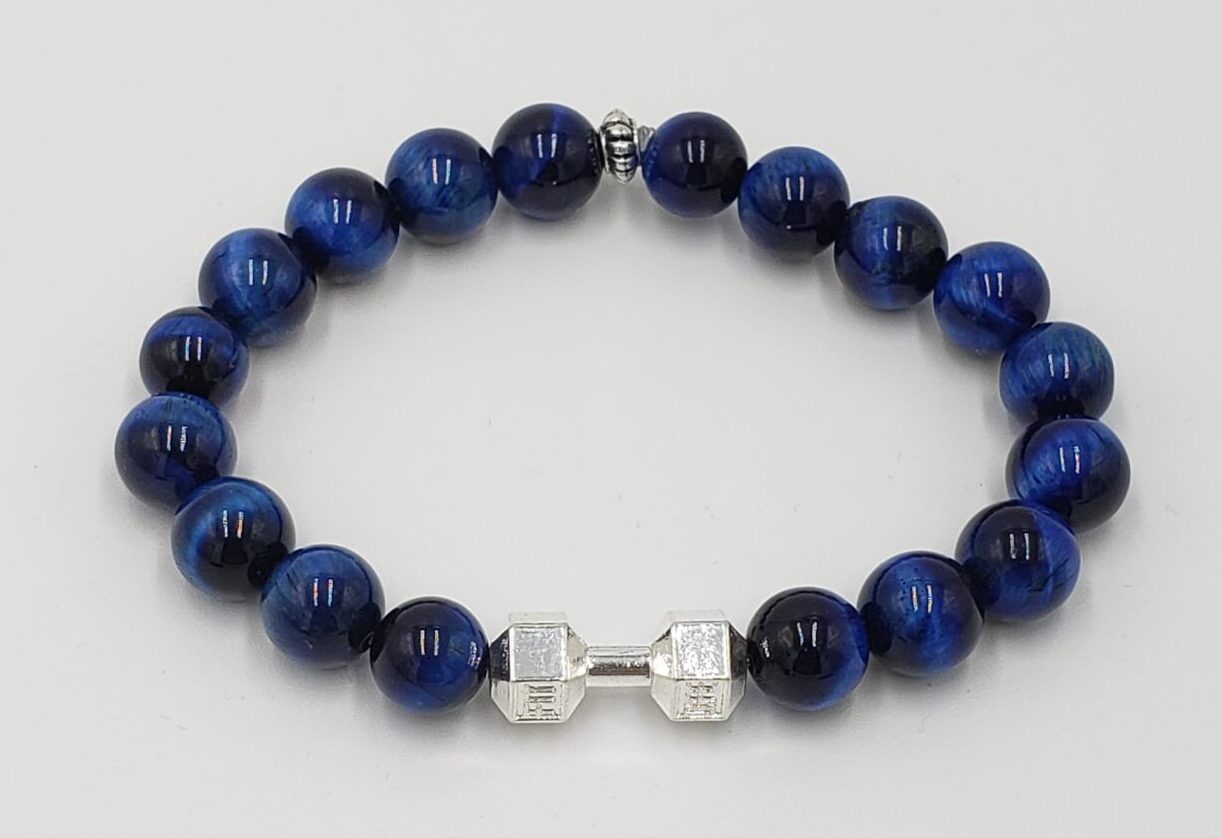 Men’s blue tiger eye stretchable bracelet with weight charm silver plated 18″.
