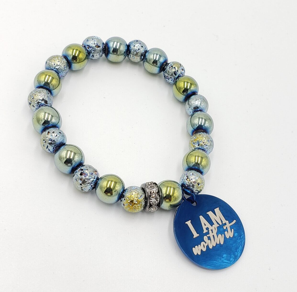 MaxxStaxx stackable bracelets cobalt blue, rainbow hematite and cobalt blue pendant “! I am worth it.