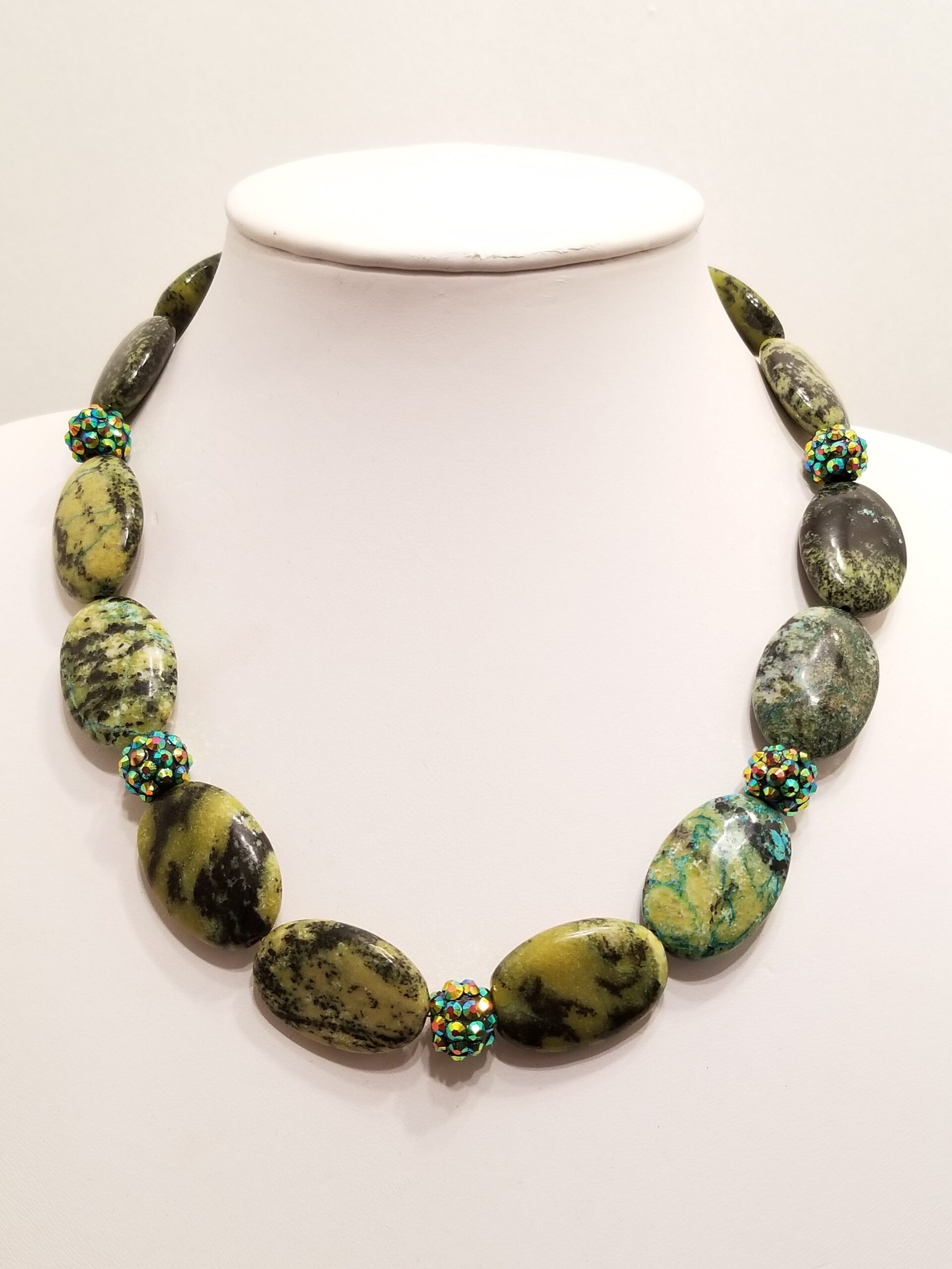 Yellow green jasper and peafowl oval beads necklace 14″ .